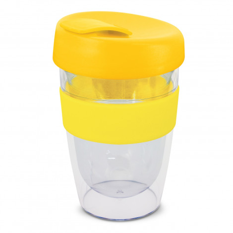 330ml double wall reusable coffee cup which will keep drinks hot for longer. It has a silicone band and a secure screw on lid with a splashproof flip closure. The cup is manufactured from crystal-clear AS plastic and the lid is polypropylene. Both materials are BPA-free. The lid, flip closure and band can be mixed and matched in any colour combination from the standard colours at no extra cost. Up to five different colour combinations are included in the price and more are available for an additional charge. An optional natural gift box is available on request. This product is not dishwasher safe and handwashing is recommended. Express Cup Leviosa is protected under New Zealand Design Registration No. 419451 and Australian Design Registration No. 361937.
