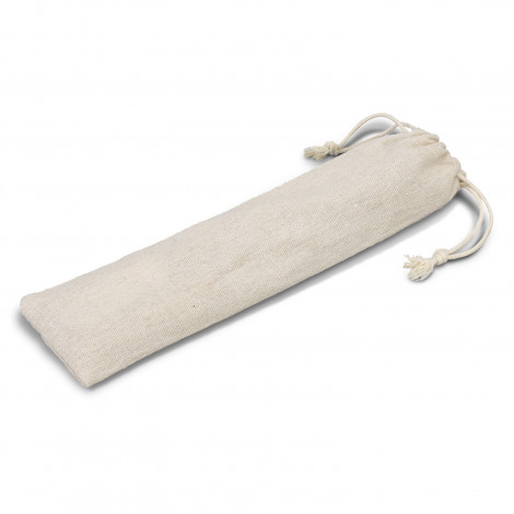 Reusable stainless-steel cutlery set stored in a convenient drawstring bag. This set is made from stainless steel and rubberwood which includes a knife, fork, spoon, straw, and straw cleaner.